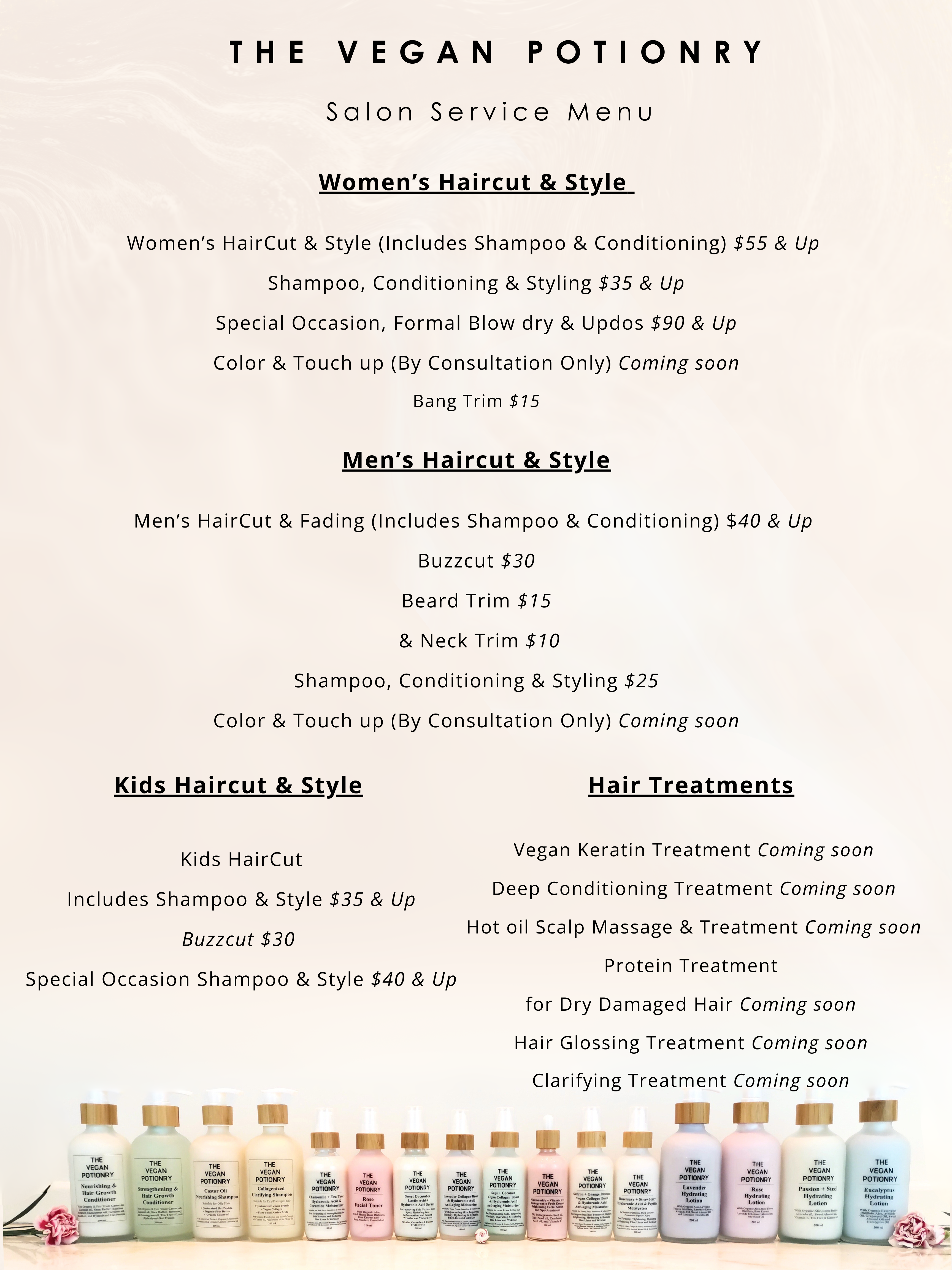 I’m your Master Stylist at The Vegan Potionry specializing in rejuvenating dry and damaged hair for over a decade. My top services are women’s haircuts, hair treatments for damaged hair, men’s haircuts and fading, and kids haircuts using our brand of natural products ❤