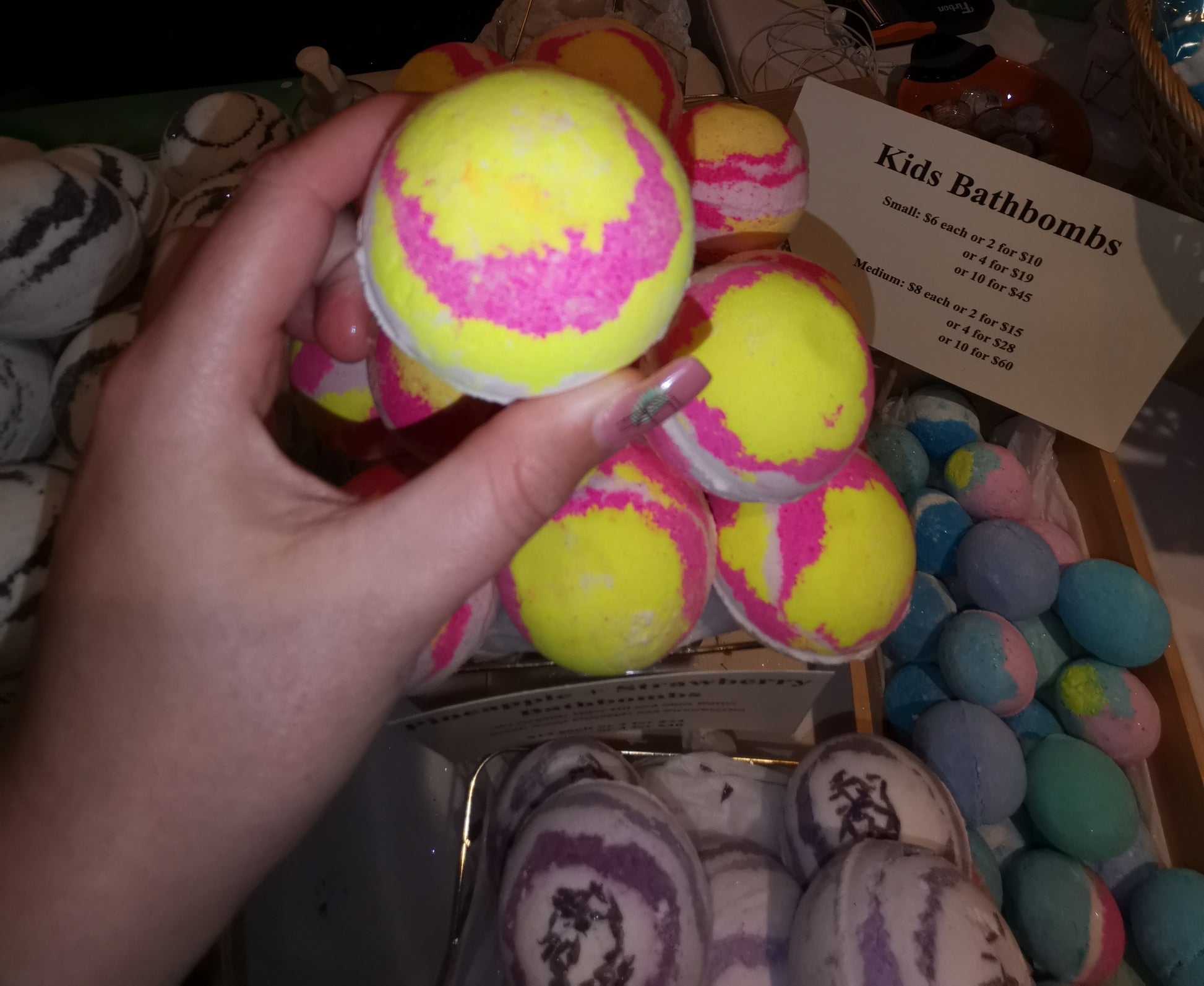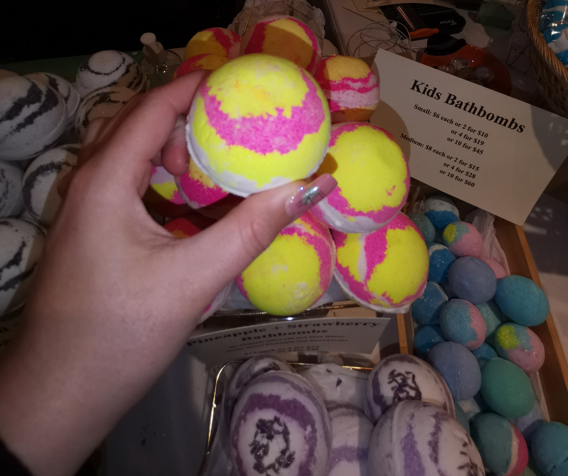 Bath Bombs are made with organic & Fair-trade Sweet Almond Oil, and/or Organic & Fair-trade Argan Oil, Organic & Fair-trade Olive Oil, Organic & Fair-Trade Shea Butter, Baking Soda, Citric Acid, Cream of Tartar, White Kaolin Clay, SLSA (Foaming Agent), Polysorbate 80 (to prevent a ring around the tub), Isopropyl Alcohol, Fragrance and ethically sourced kid safe pigments!
