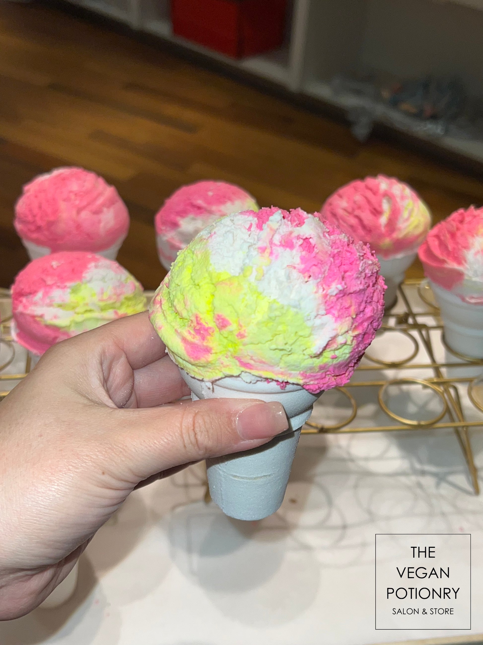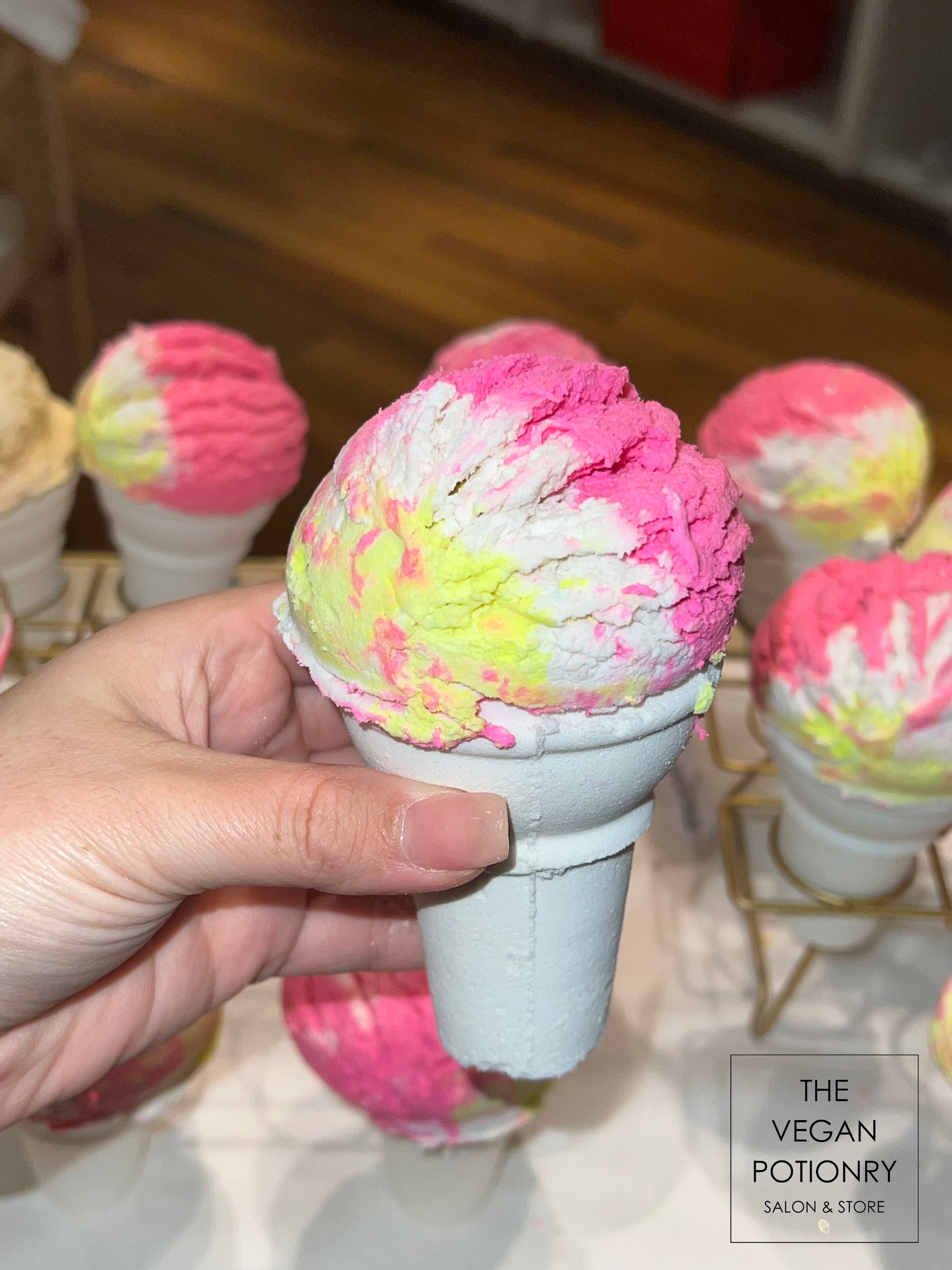 Indulge in a sweet and creamy bath experience with The Vegan Potionry’s Ice Cream Bubble Bombs—a fun, one-of-a-kind bath bomb/bubble bath hybrid that will elevate your bath time!