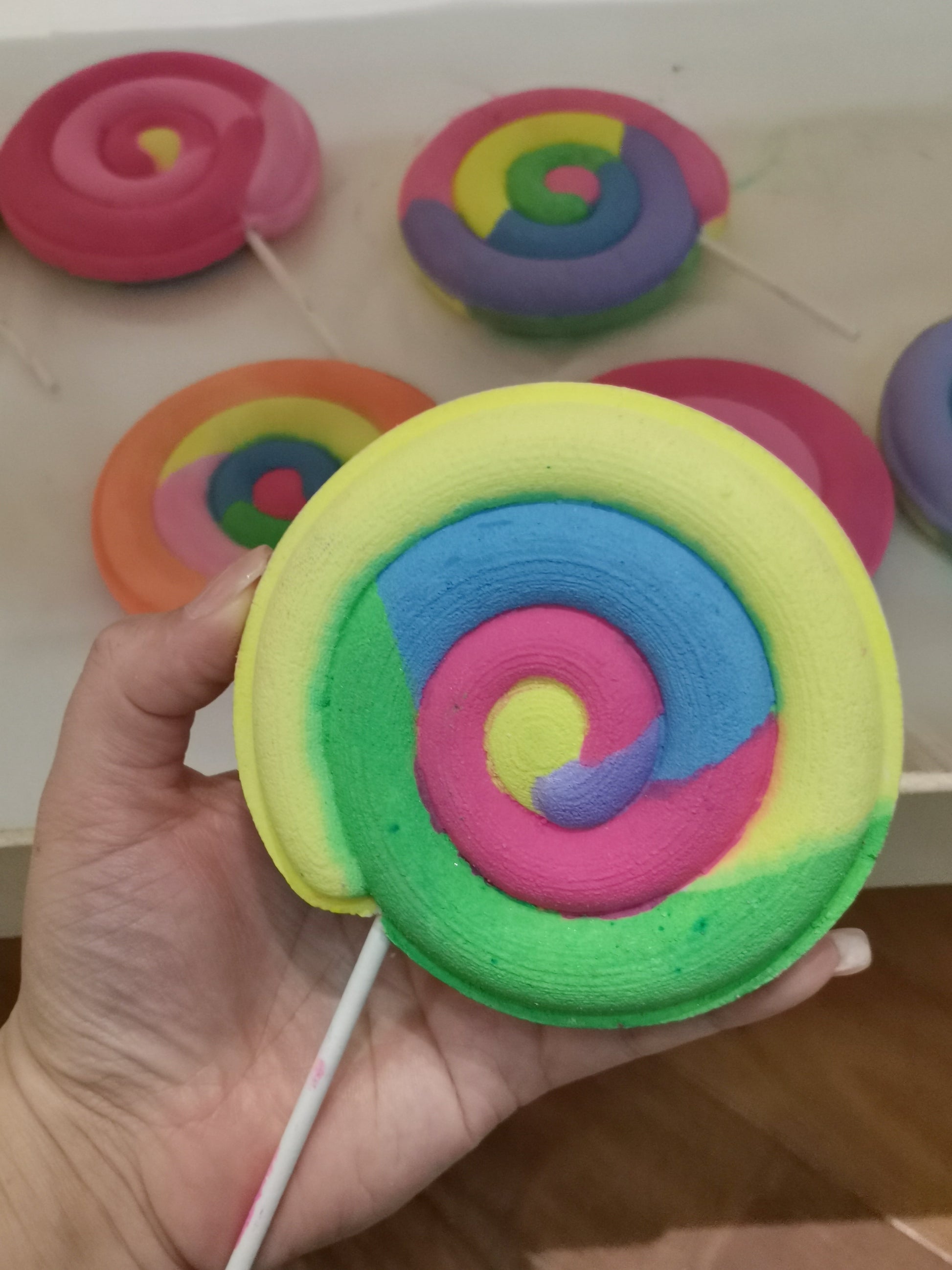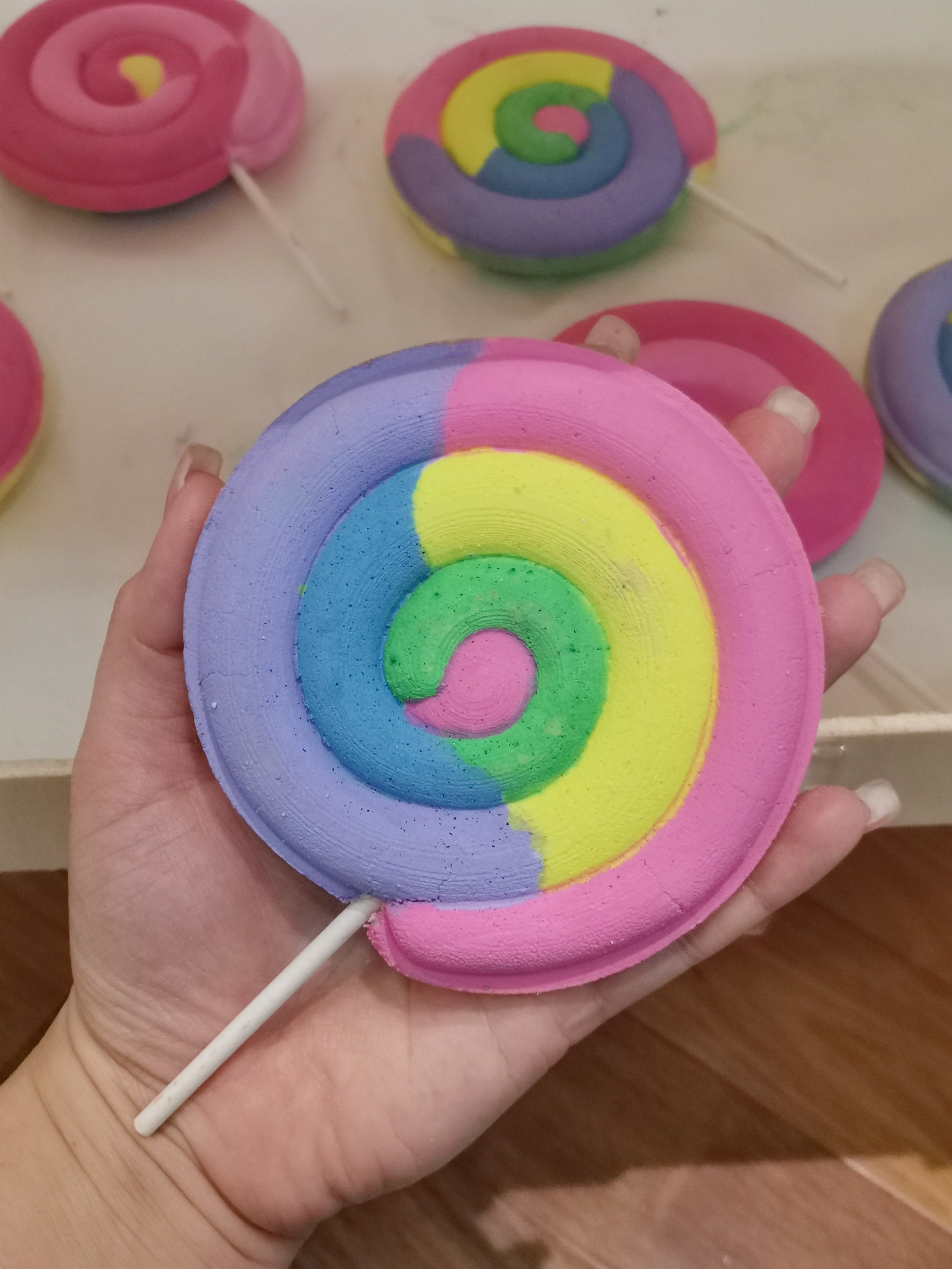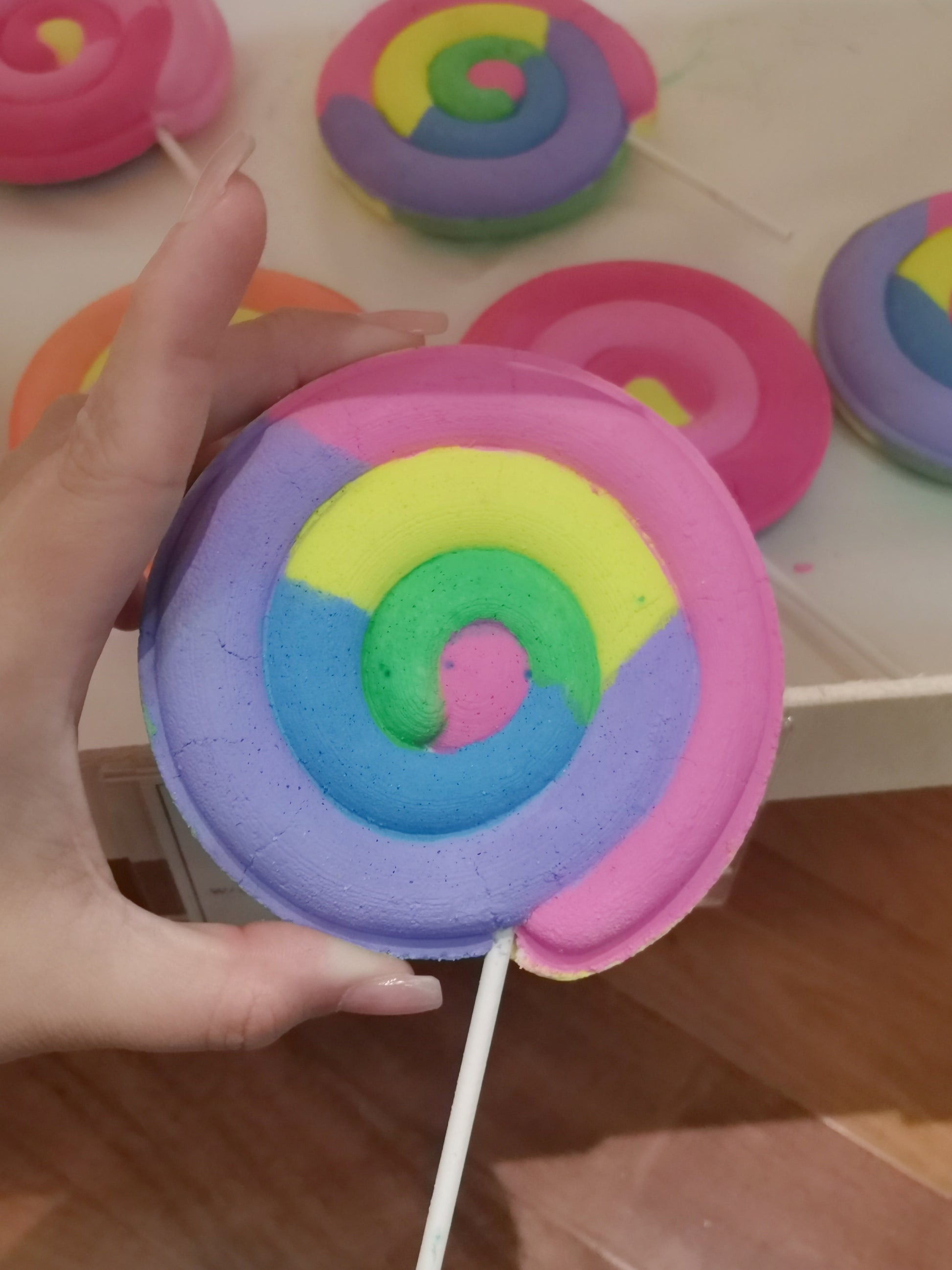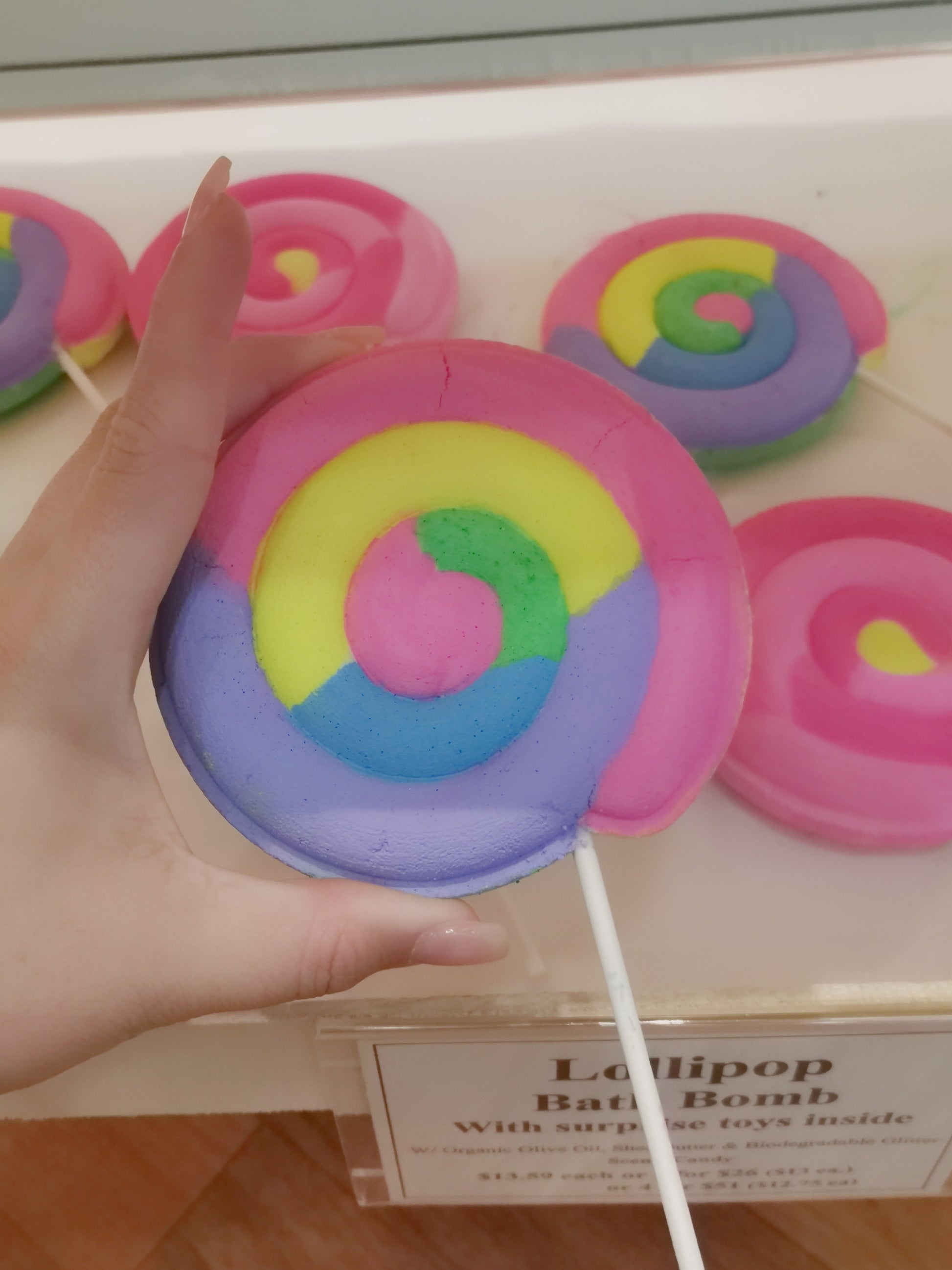 One of our top sellers, these Lollipop Bath Bombs are full of colorful pigments that give you a very bright and fun bath time. Armed with cute little charms and toys inside, these Lollipop Bath Bombs are a must have!