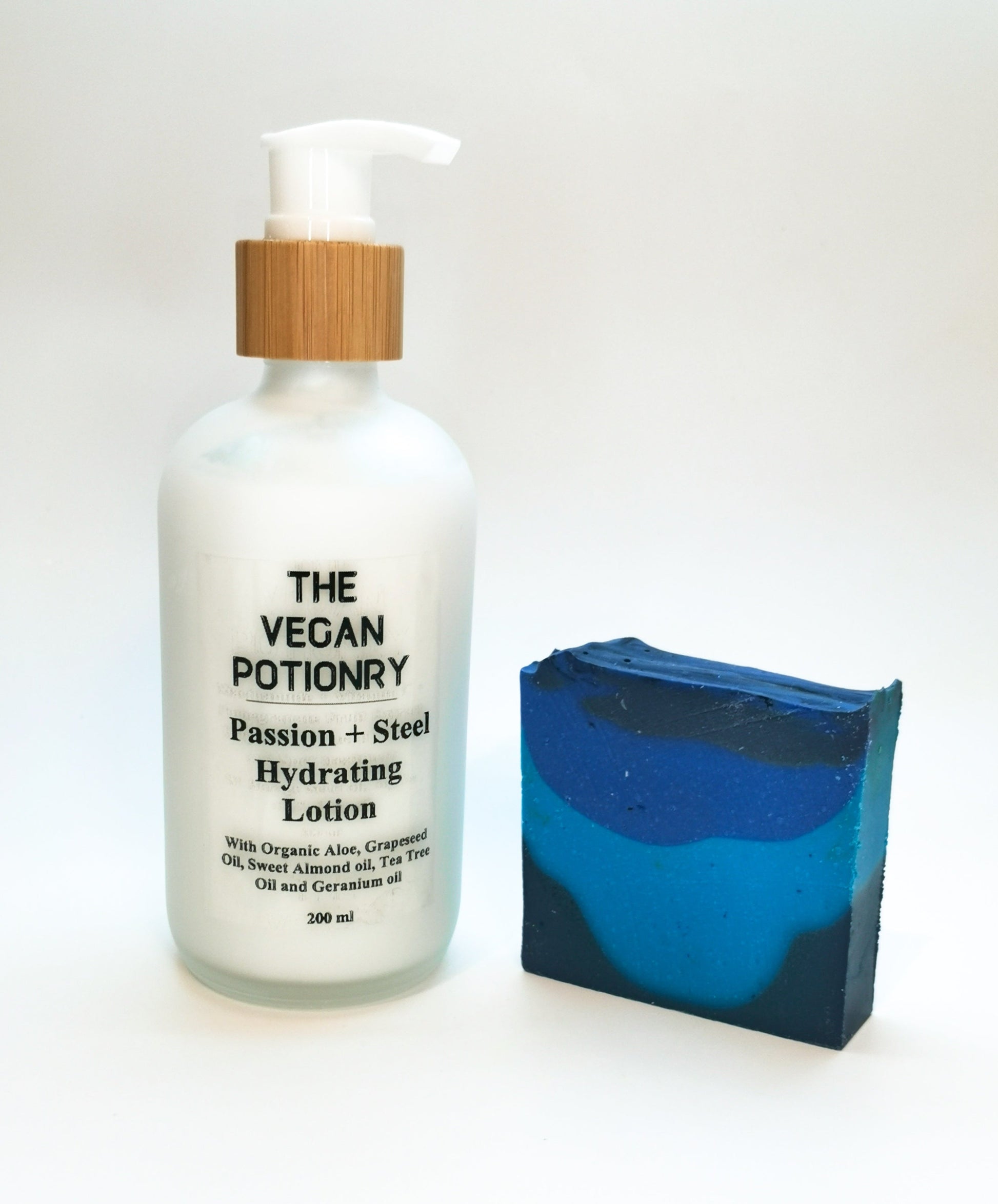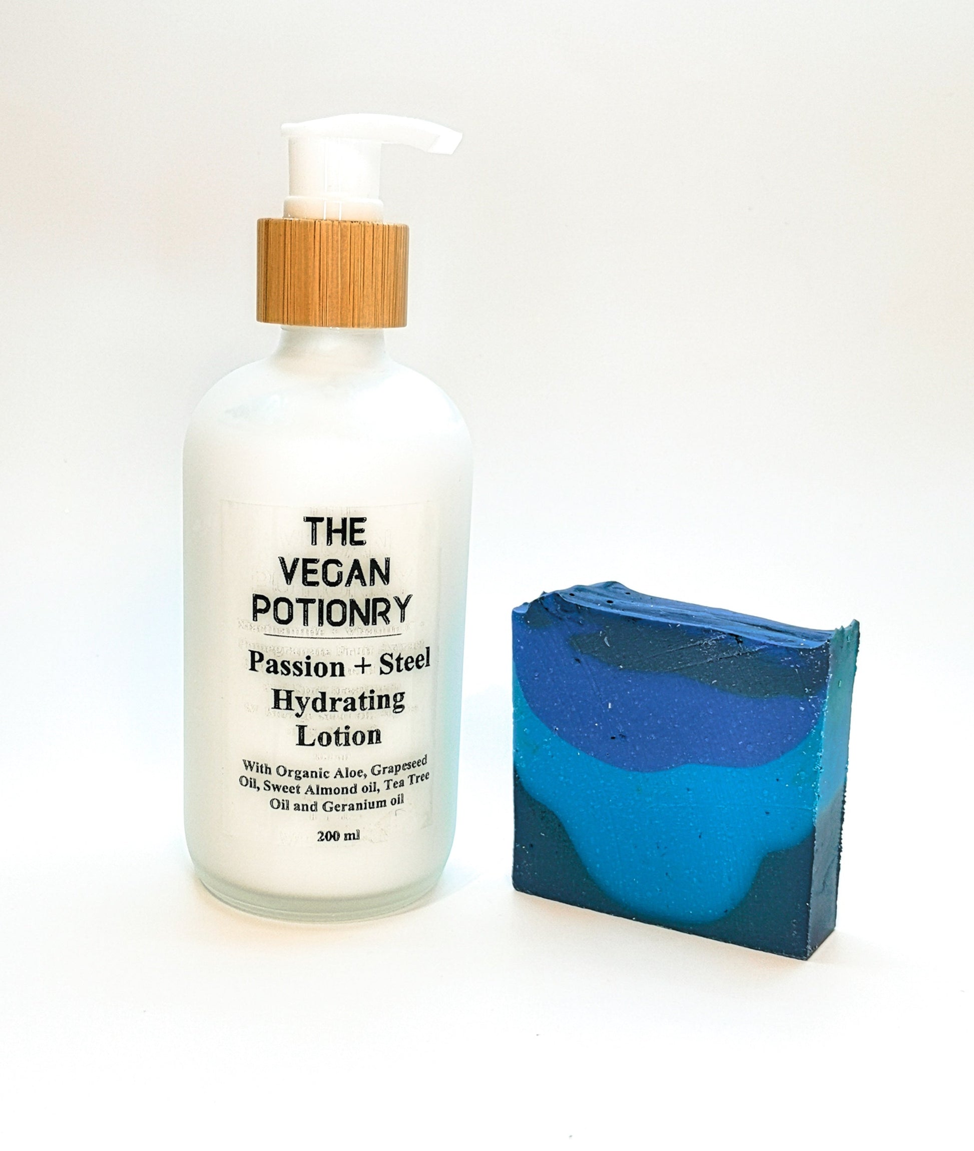 The Vegan Potionry's Passion and Steel Hydrating Soap is a refreshing and hydrating soap with customer favorite masculine top notes made with Organic, Fair Trade and Sustainable Coconut Oil, Shea Butter, Mango Butter, USA grown Organic Sunflower oil, Sweet Almond oil, and Peanut Oil. INGREDIENTS: