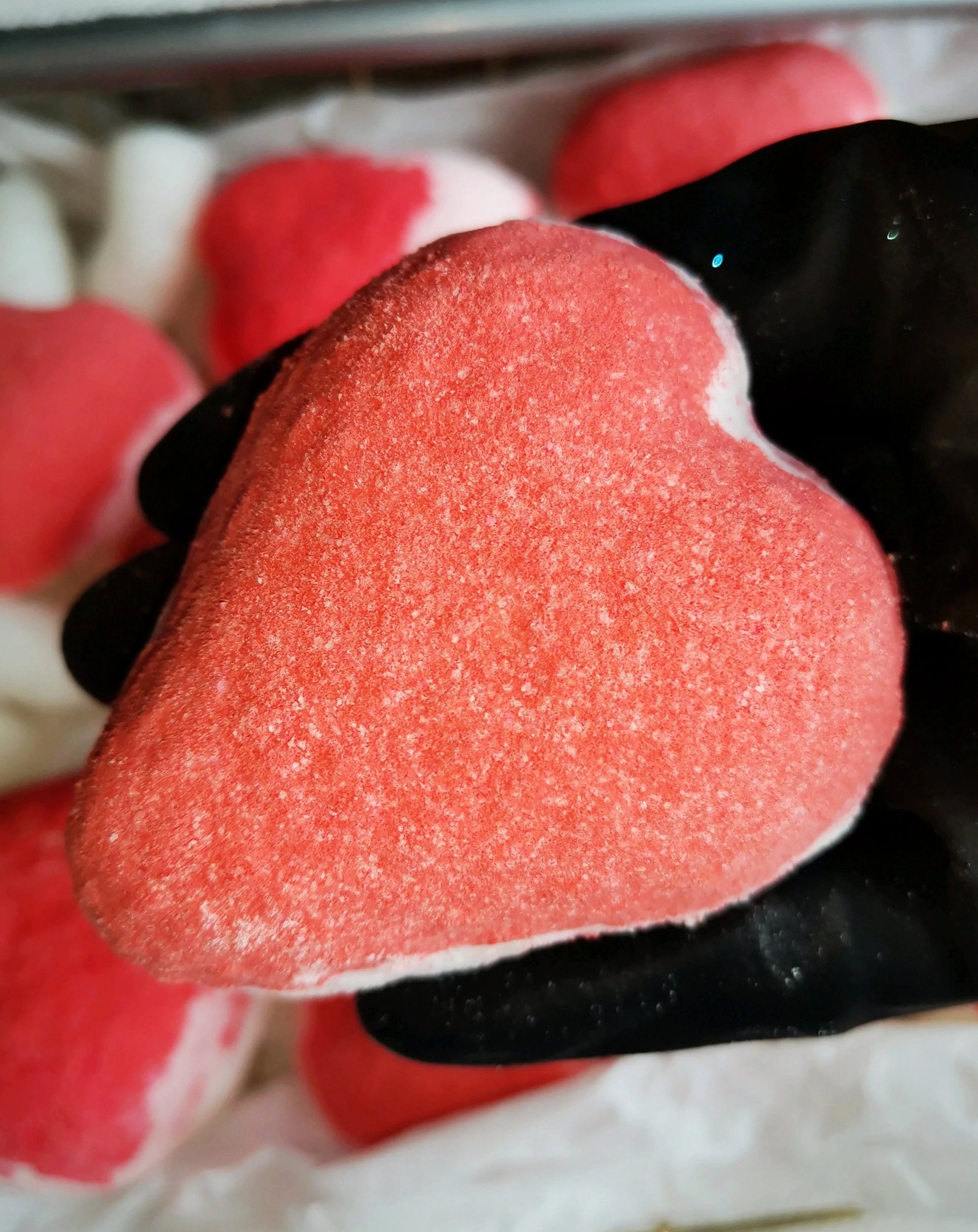 Strawberry Bath Bombs are made with Organic & Fair-trade Sweet Almond Oil, and/or Organic & Fair-trade Argan Oil, Organic & Fair-trade Olive Oil, Organic & Fair-Trade Shea Butter, Baking Soda, Citric Acid, Cream of Tartar, White Kaolin Clay and Citric acid.