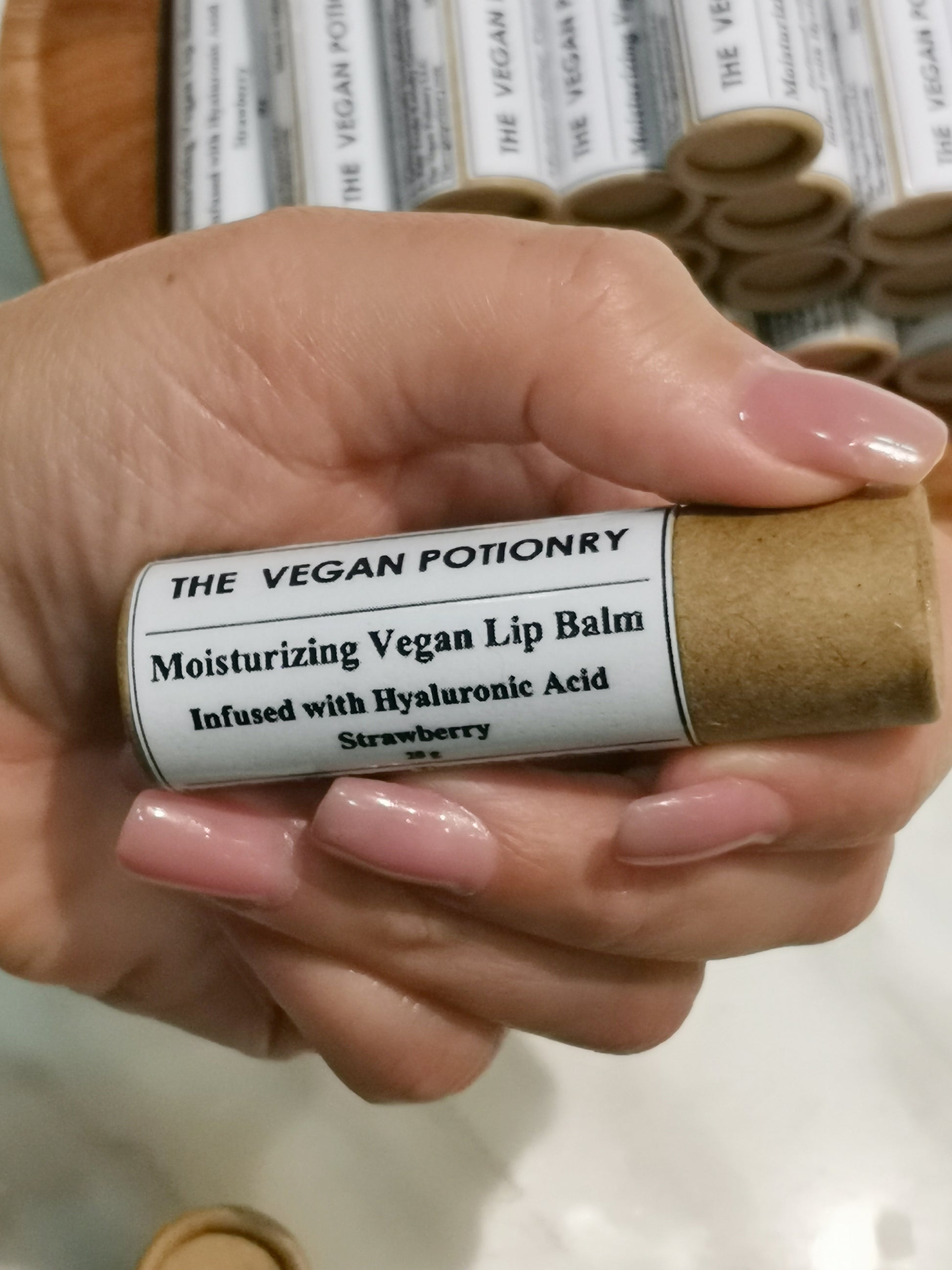 Chapped lips no more!! The Vegan Potionry's Moisturizing Vegan Lip Balm is a hydrating, nourishing and delicious remedy to keep your lips soft and smooth. Infused with Hyaluronic Acid to bring more moisture into your lips and keep your lips soft for hours!